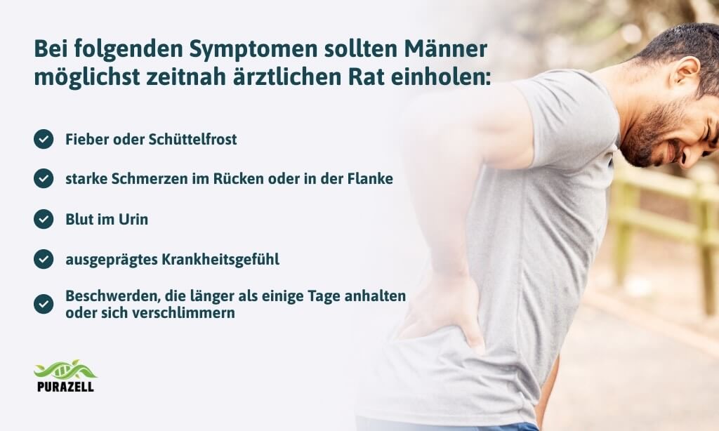 Wenn Männer zusätzlich Probleme beim Wasserlassen bemerken – etwa einen sehr schwachen Harnstrahl, Schmerzen oder das Gefühl, die Blase nicht vollständig entleeren zu können – kann dies auf eine Beteiligung der Prostata oder eine andere Ursache für einen komplizierten Harnwegsinfekt hinweisen.