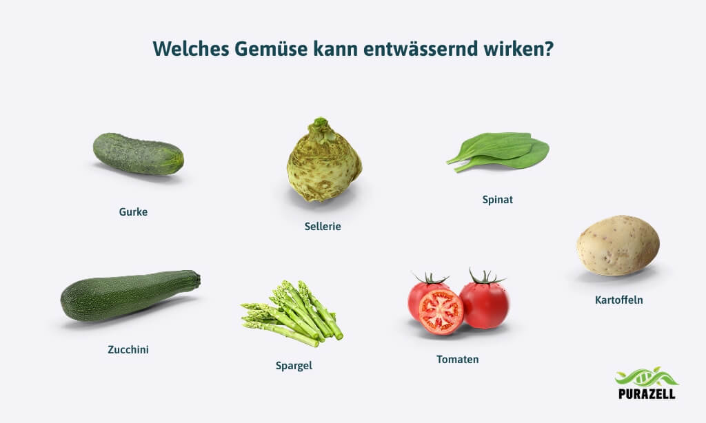 Vor allem wasserreiche Obst- und Gemüsesorten können die Harnausscheidung unterstützen. Dazu zählen beispielsweise Gurken, Tomaten, Spargel, Zucchini, Wassermelone oder Erdbeeren. Zusätzlich können kaliumreiche Lebensmittel die Ausscheidung von Natrium und damit gebundenem Wasser fördern.