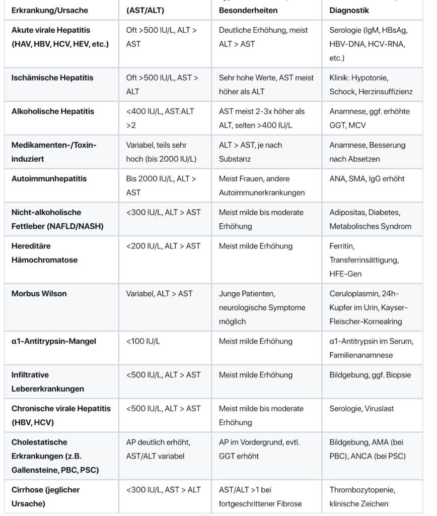 Häufige Ursachen sind Fettleber, Alkohol, Medikamente, Virushepatitis, Gallenwegserkrankungen, Stoffwechselstörungen und Autoimmunerkrankungen.