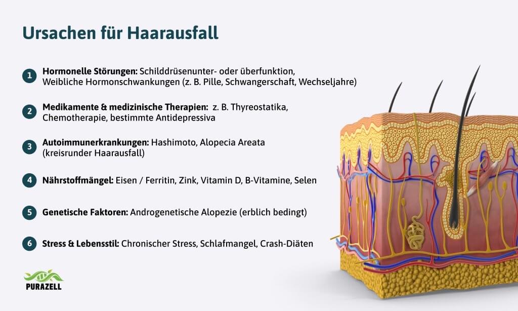 - Schilddrüsenerkrankungen beeinflussen den Haarzyklus, da die Hormone T3 und T4 für Wachstum und Regeneration der Haarfollikel entscheidend sind.