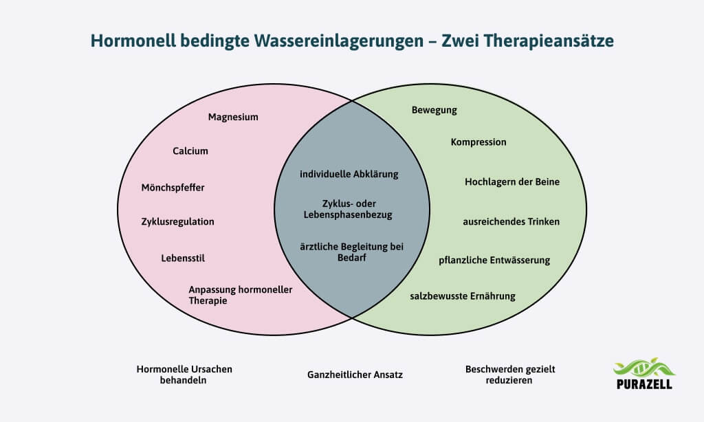 Bei einer hormonell bedingten Wassereinlagerung liegt die Ursache im Gegensatz zu vielen anderen Ödemen jedoch nicht primär in einer Erkrankung von Herz, Nieren oder Venen, sondern in natürlichen hormonellen Schwankungen.