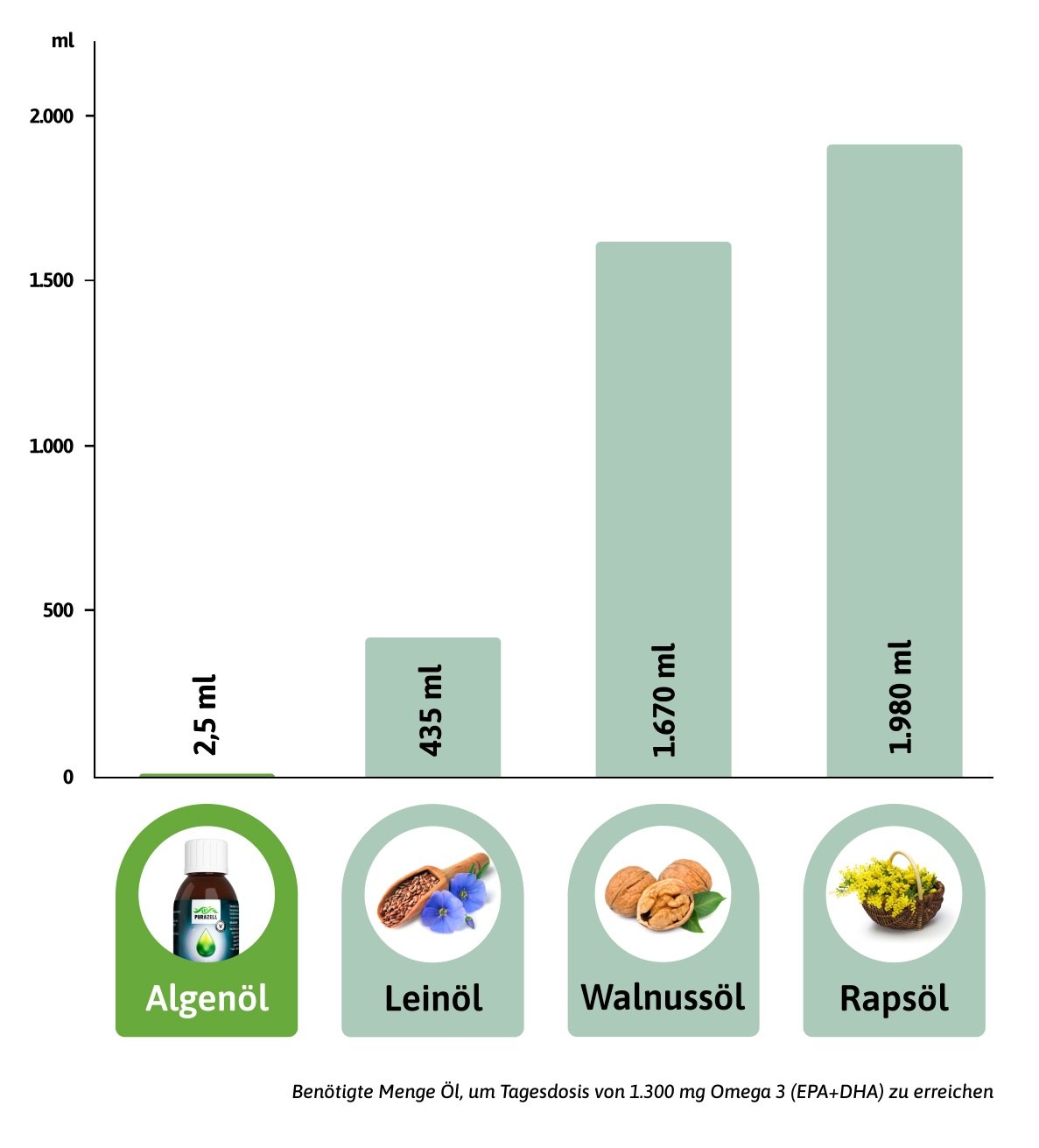 Alternativ decken bereits 2,5 ml Algenöl effektiv, geschmacksneutral und 100 % pflanzlich deinen Tagesbedarf an EPA und DHA – ohne einen unnötigen Umweg über ALA.
