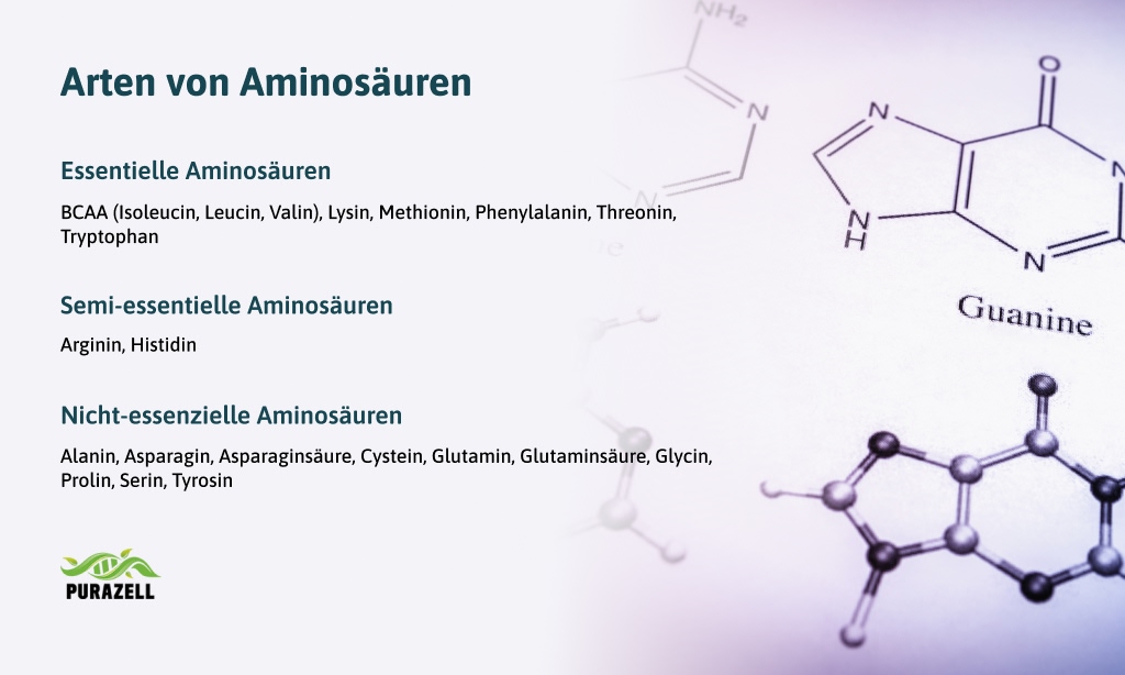 - Semi-essenzielle Aminosäuren: Werden aus essenziellen Aminosäuren vom Körper selbst gebildet, was die Herstellung nur möglich macht, wenn genug der spezifischen essenziellen Vorläuferaminosäure vorhanden ist.