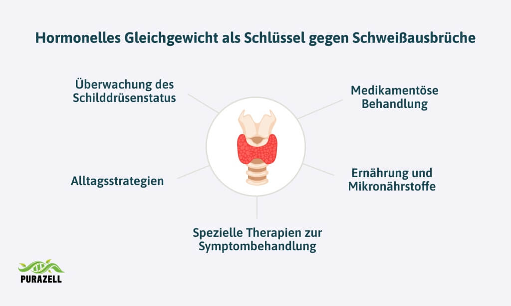 Das bedeutet konkret: Wer an einer Schilddrüsenüberfunktion oder -unterfunktion leidet, sollte die Therapie eng mit dem behandelnden Arzt abstimmen und regelmäßig die Hormonwerte kontrollieren lassen. Nur so lässt sich sicherstellen, dass die Schilddrüse wieder ins Gleichgewicht kommt und der Körper die Temperatur- und Schweißregulation normalisieren kann.